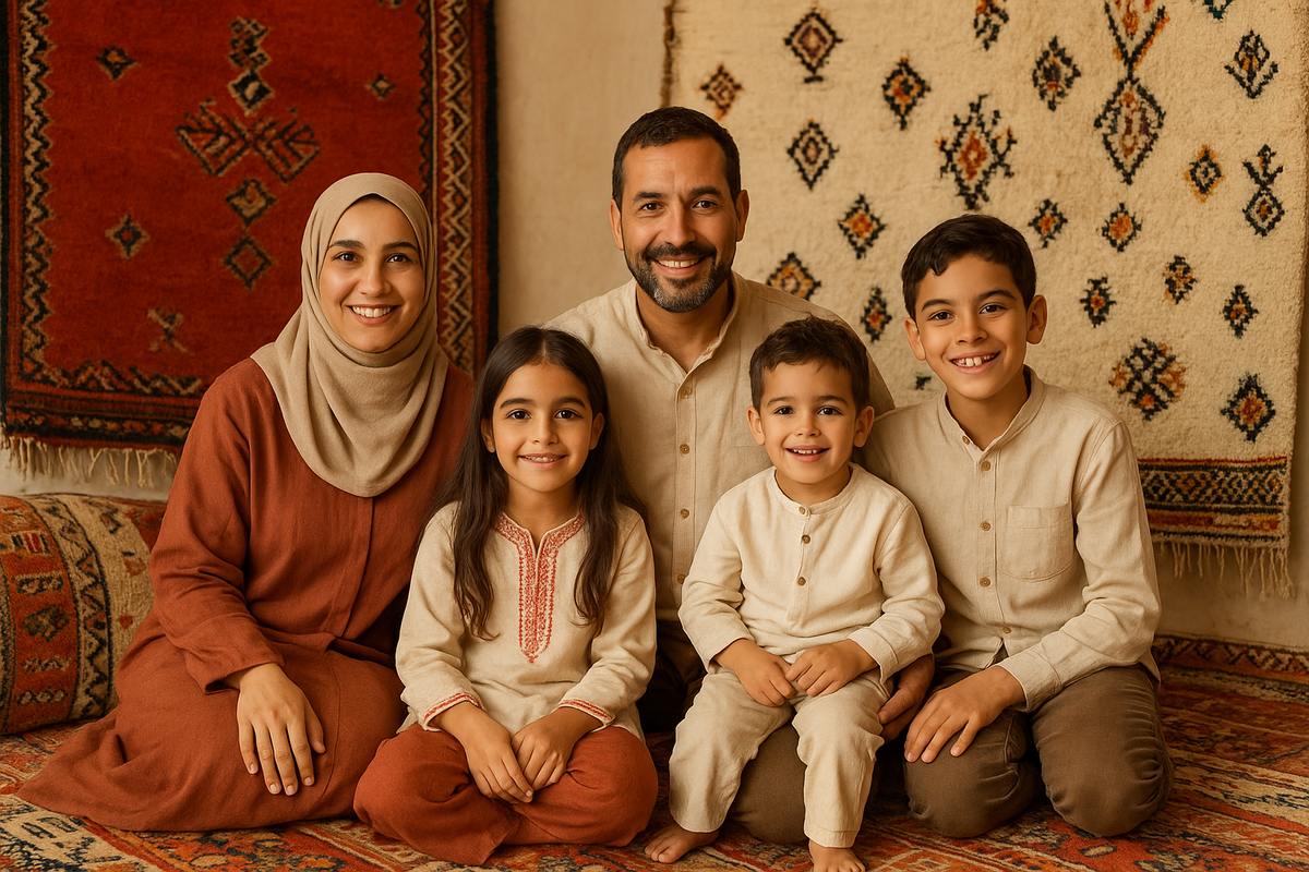 We are a family of five — a devoted mother, a hardworking father, and three children — living in the heart of the Middle Atlas Mountains of Morocco. Our home is where tradition meets craftsmanship, and every rug we create carries the soul of our land, woven with heritage, love, and dedication.